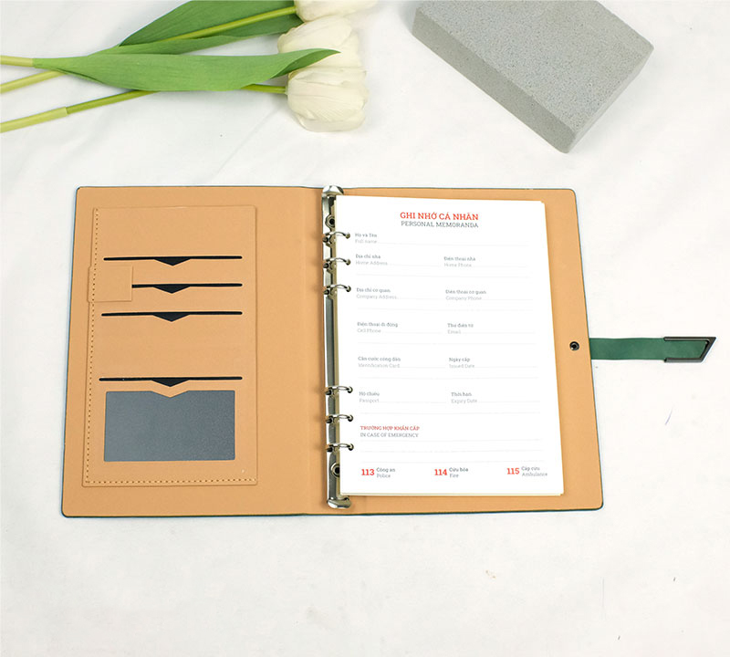 – Có ngăn đựng card visit, thẻ visa, còng 6 lỗ inox 1.5cm