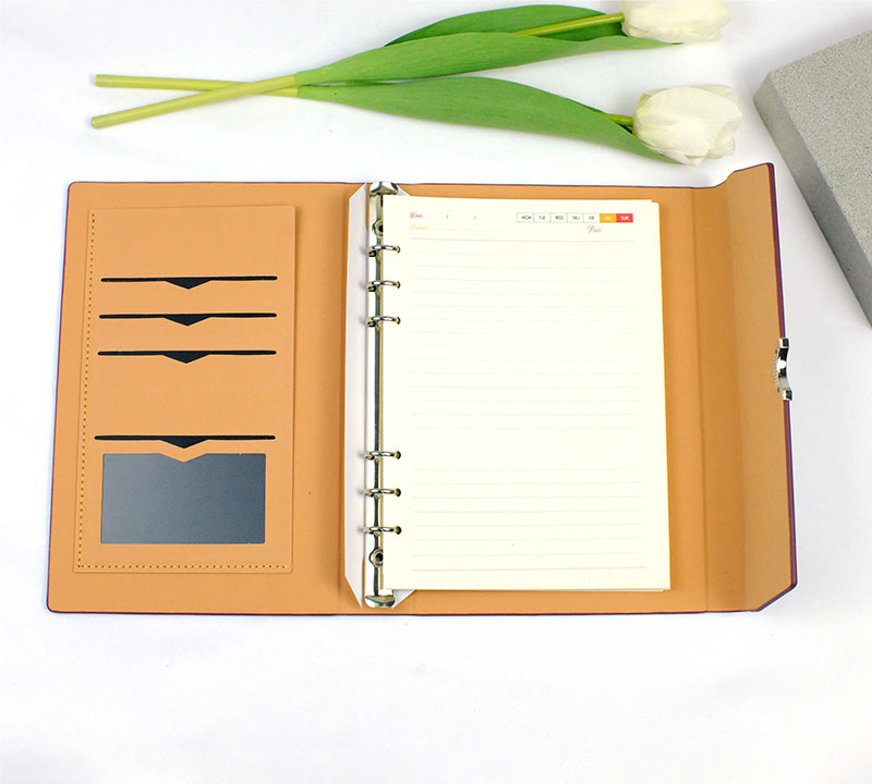 – Có ngăn đựng card visit, thẻ visa, còng 6 lỗ inox 1.5cm