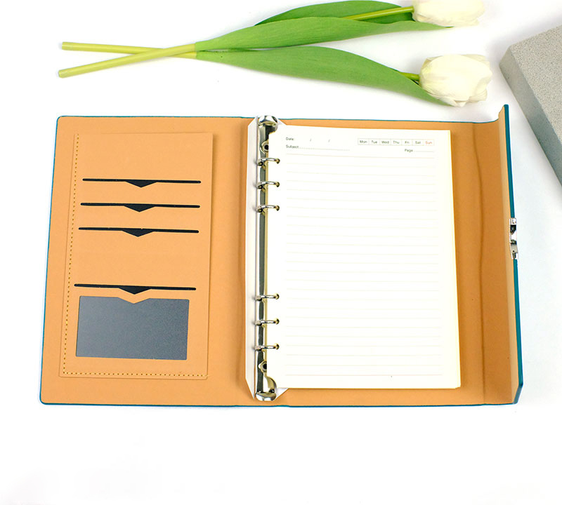 – Có ngăn đựng card visit, thẻ visa, còng 6 lỗ inox 1.5cm