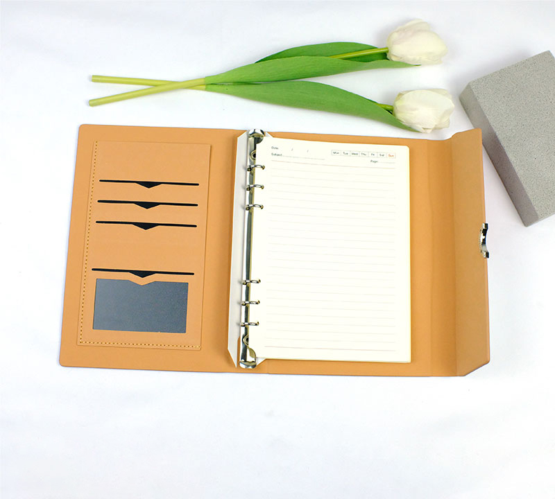 – Có ngăn đựng card visit, thẻ visa, còng 6 lỗ inox 1.5cm