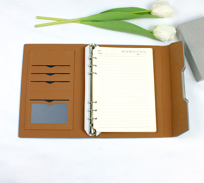 – Có ngăn đựng card visit, thẻ visa, còng 6 lỗ inox 1.5cm