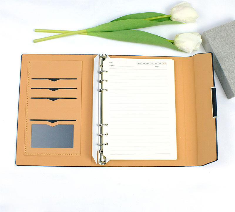 – Có ngăn đựng card visit, thẻ visa, còng 6 lỗ inox 1.5cm