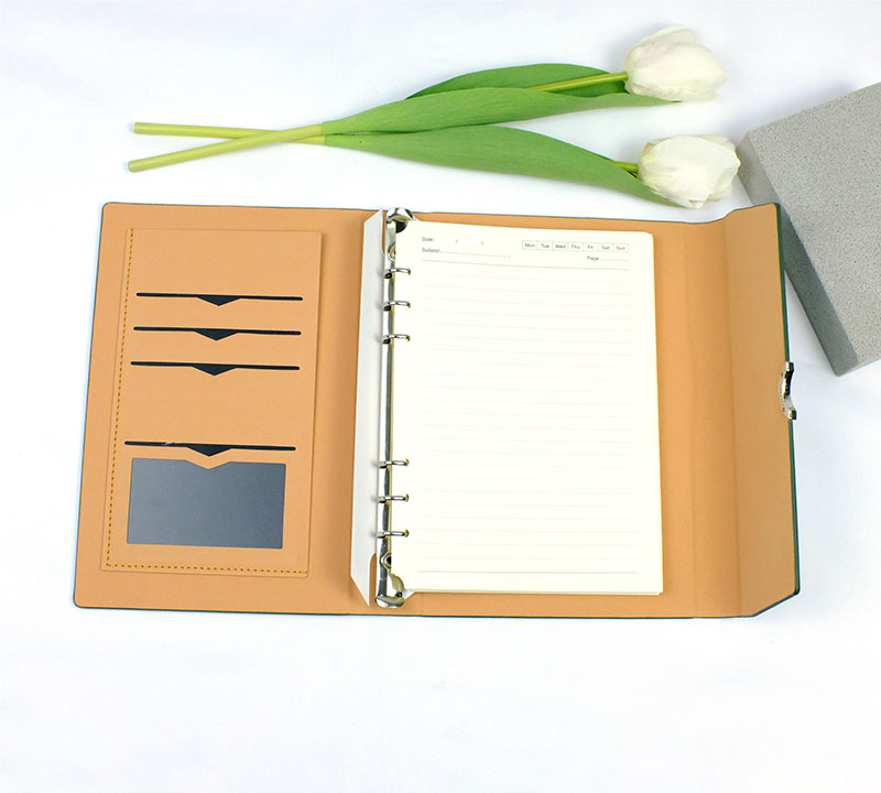 – Có ngăn đựng card visit, thẻ visa, còng 6 lỗ inox 1.5cm
